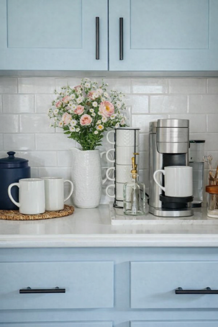 If your budget allows and you want a more permanent solution, working with a kitchen designer to create a custom coffee bar with cabinetry can be a beautiful upgrade.
