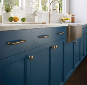 - Navy / Blue Cabinets – Coastal to transitional, blues pair well with pewter, black, gold, or chrome.