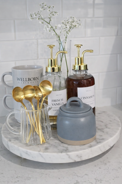 Store your coffee, tea, sugar, syrups, and stir spoons in decorative containers that complement your kitchen design. If you are investing in a new coffee maker, choose one that fits both your space and the overall aesthetic of your home.