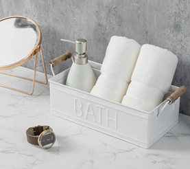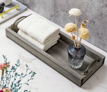 Powder rooms are the perfect place to showcase decorative accents. Pretty trays with soaps and candles, vases with fresh flowers, plush hand towels, decorative baskets, and stylish trash cans all contribute to the overall feel of the space.
