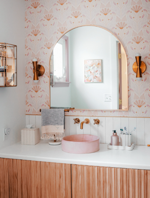 An easy way to transform your powder room is with wallpaper. Whether you choose a dramatic floral, modern geometric, or coastal inspired print, wallpaper instantly adds personality and visual interest.